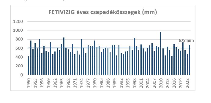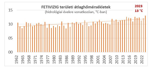 A rendelkezésünkre álló, sokéves átlaghőmérséklet adatok alapján egyértelmű, trendszerű növekedés figyelhető meg a FETIVIZIG területén, azonban a 2023-as hidrológiai év még így is kiemelkedő, 13 °C-os értékével az elmúlt 60 év legmagasabbja volt.