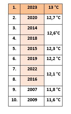 Az évi átlagos léghőmérsékletek rangsorában az első 8 helyen kivétel nélkül az utóbbi évek szerepelnek, mindössze a 2017-es és 2021-es év nem került bele a 10-es listára. Míg 1960-1990 közötti években 8-10 °C környékén alakultak az átlaghőmérsékletek, jelenleg ez már 11-13 °C közé tehető.