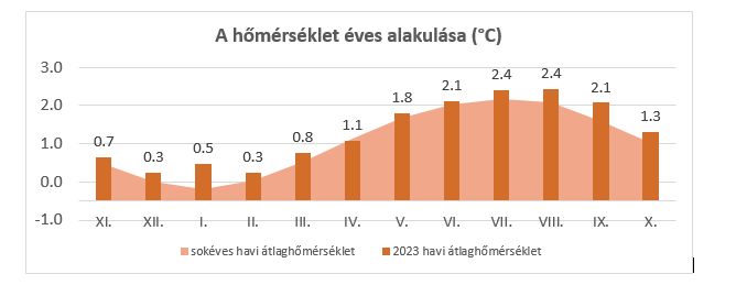 A 2023-as hidrológiai év léghőmérsékleti alakulásának vizsgálatában április kivételével folyamatosan átlag felettiek voltak a havi átlagok. Az augusztusi hónap 3 °C-kal múlta felül azt, valamint a téli hónapokban sem csökkent 2 °C alá a havi átlag, melynek negatív következményei lehetnek a mezőgazdaságra, vegetációra is.