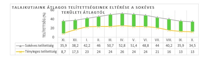 Az elmúlt évben a téli csapadék miatt emelkedett a talajvíz átlagos szintje. Az idei évben az egyenletes csapadéktevékenységnek köszönhetően a talajvízszintek nem süllyedtek a tavalyi évi alacsony szintekre, de a nyári csapadéktöbblet sem okozott talajvízszint-emelkedést a magas léghőmérséklet, párolgás miatt. Jelenleg a FETIVIZIG működési területén a talaj vízzel való telítettsége átlagosan 13 %. A legmagasabb a talajtelítettség a Felsőszabolcsi öblözetben mérhető (17 %), a legalacsonyabb az Ecsediláp öblözetben (7 %). A sokéves átlaghoz képest egész évben 20-27 %-kal alacsonyabbak voltak a talajtelítettségi értékek talajkútjainkban.