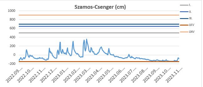 A Szamos folyón egész évben nem volt készültségi szintet megközelítő árhullám, nyártól a vízszintek folyamatosan a kisvízi tartományban mozogtak. Csengernél, 2022. július 23-án dőlt meg a korábbi kisvízi rekord, -143 cm-rel. Ezt az értéket érte el már idén október elejétől többször is a vízszint, majd 2023. október 10-én a vízállás -147 cm volt, így újra megdőlt az LKV. Ekkor a vízhozammérés eredménye 19,0 m3/s volt. Az alsó szakaszon, Tunyogmatolcsnál is megközelítette a vízállás a korábbi legkisebb mért értéket, azonban azt nem lépte át.