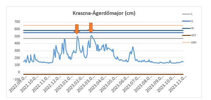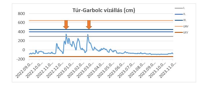 A Túr és Kraszna folyóinkon is több árhullám vonult le, amely I. fokú készültségi szintet lépett át. A Túron, Garbolcon 2022 decemberében, és 2023 februárjában ért el a vízszint ezt az értéket, majd az év további részében alacsony vízállások uralkodtak. A Krasznán, Ágerdőmajor állomáson januárban és márciusban érte el a vízállás az I. fokot.