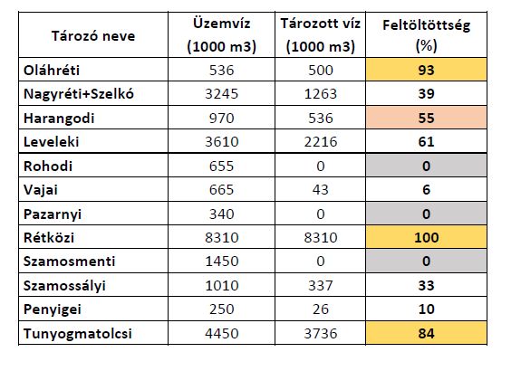 Működési területünkön 12 tározót üzemeltetünk, melyek összesen több, mint 33 millió m3 víz tározására képesek. Ehhez képest az október végi, 17 millió m3 összvíztérfogat 67%-os feltöltöttségnek felel meg. Üres a Rohodi, Pazarnyi és a Szamosmenti tározónk. Nagyon kevés a víz a Vajai, Penyigei tározóban. A Harangodi tározót sikerült 82 %-os szintre tölteni júniusban, jelenleg 55 %-os, tavaly októberben üres volt. Magas feltöltöttségű a Rétközi, az Oláhréti és a Tunyogmatolcsi tározónk. Az év során februárban volt a legtöbb víz tározóinkban (75 %-os volt a telítettség), és augusztusban a legkevesebb (59 %)