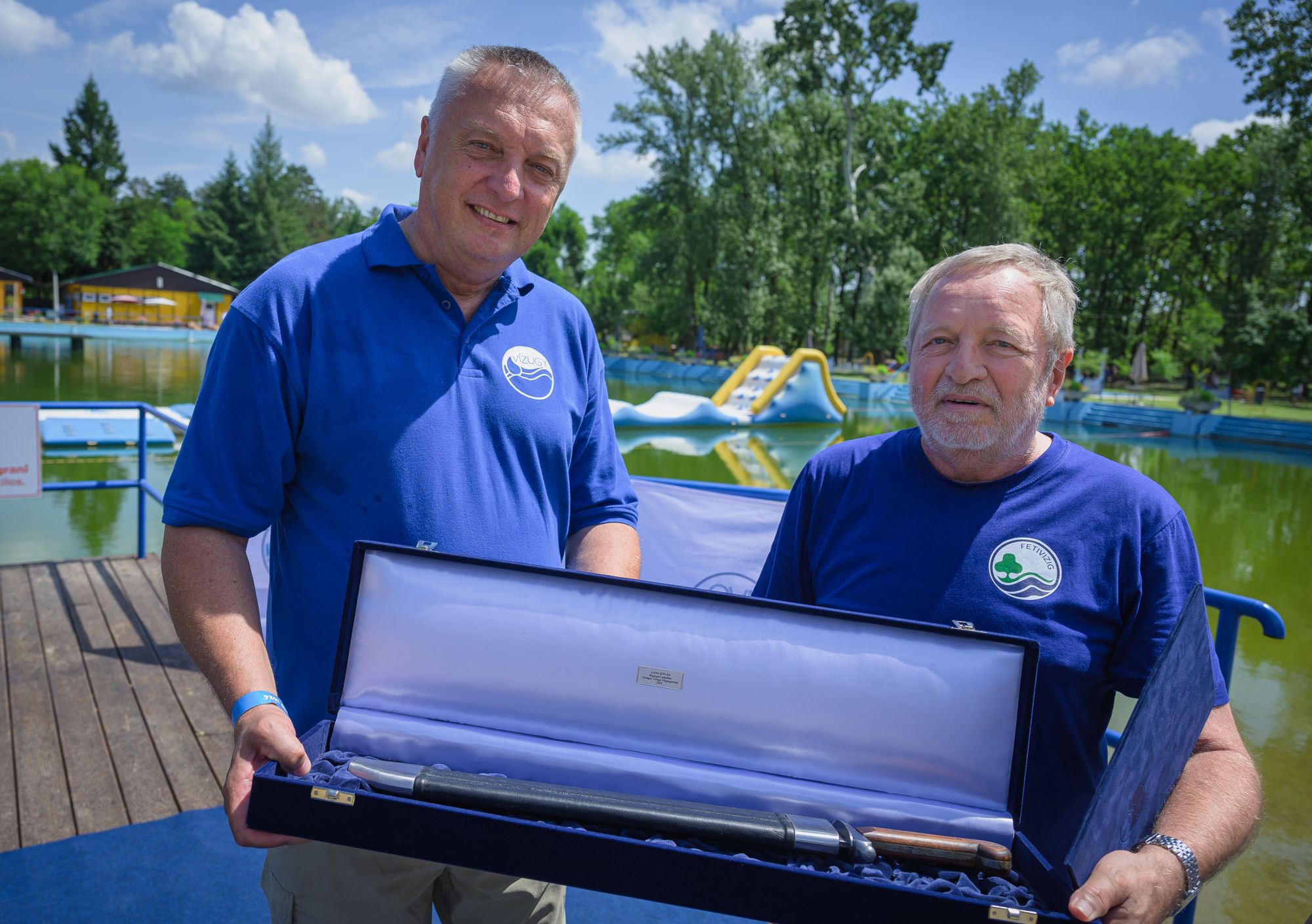 A képen Bodnár Gáspár nyugalmazott igazgató és Láng István főigazgató látható, az előbbi a gátőrkard kitüntetését veszi át.