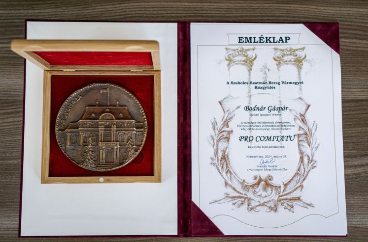 A képen egy díszes mintázatú emléklap látható Bodnár Gáspár részére kiállítva, rajta az alábbi szöveggel „Szabolcs-Szatmár-Bereg Vármegyei Közgyűlés Bodnár Gáspár vízügyi igazgató részére a vármegye fejlődésének elősegítése, felemelkedésének előmozdítása érdekében, kifejtett tevékenysége érdekében "PRO COMITATU" díjat adományoz. ” és egy Nyíregyháza felirattal ellátott barna emlékplakett.
