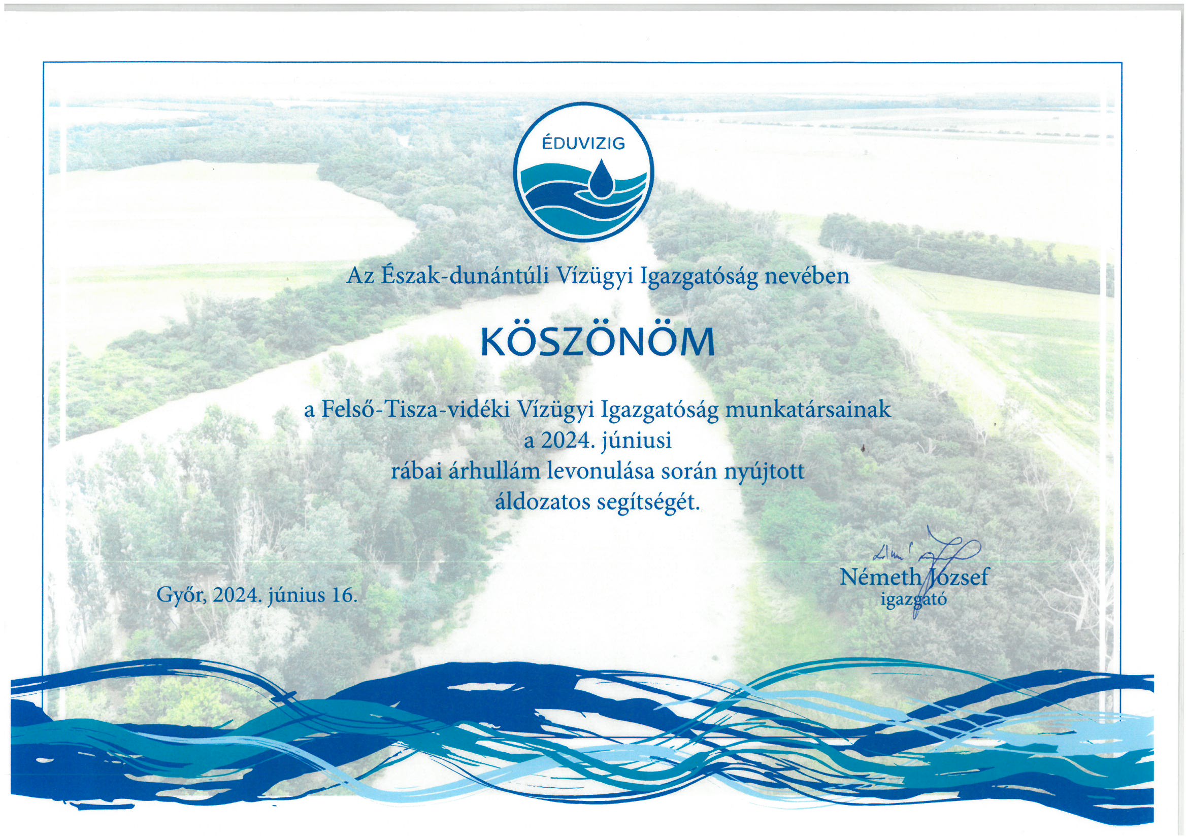 A képen egy KÖSZÖNÖM felíratú oklevél látható ÉDUVIZIG logóval, amin a FETIVIZIG munkatársainak mondanak köszönetet a 2024-es júniusi rábai árullám levonulása során nyújtott segítségükért.