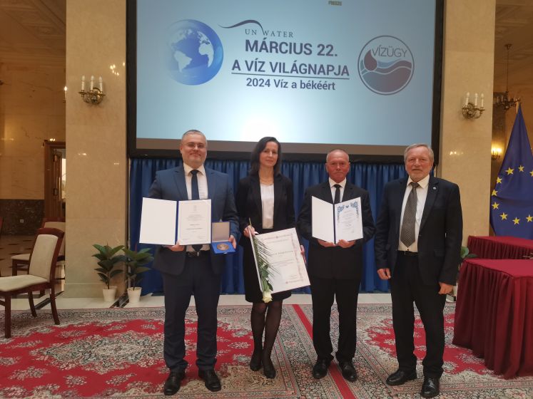 A képen Somogyiné dr. Gerliczky Judit a Közfoglalkoztatási Önálló Osztály osztályvezetője, Ambrusz László a Titkárság osztályvezetője és Varga Sándor a Felsőszabolcsi Szakaszmérnökség gát- és csatornaőre látható okleveleikkel Bodnár Gáspár igazgató társaságában. Háttérben a 2024-es Víz Világnapi szlogennel és felirattal, melyen az alábbi szöveg olvasható „Március 22. A VÍZ VILÁGNAPJA. 2024 Víz a békéért”.