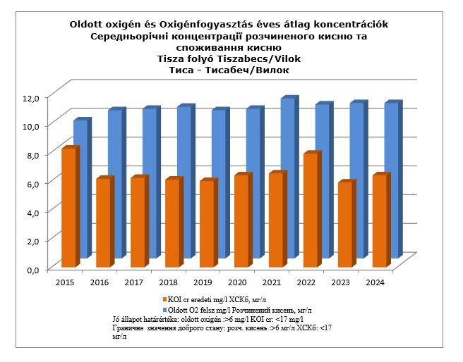 A Szabályzat 12. sz. cikkelyének megfelelően a vízminőségi állapotváltozás tendenciáinak értékelését végeztük el 2015-2024 közötti időszakra vetítve, azokra a vízminőségi jellemzőkre, amelyeket a mintavételezésért és a mérésekért felelős személyek határoztak meg. A két ellenőrzési mintavételi szelvényben - Tiszabecs/Tiszaújlak (Vilok) és Záhony/Csap (Csop) - 2024-ben az alábbi 6 vízminőségi jellemzőre (oldott oxigén, KOIcr, ammónium-N-ra (NH4-N), nitrát-N (NO3-N), ortofoszfát-P (PO4-P) és klorofill-a) vonatkozóan az eredmények a vizsgált időszakban nem haladták meg a víz „jó” minőségű állapot határértékét.