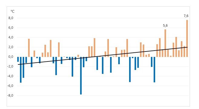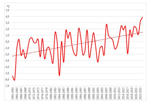 A következő diagram a klímaváltozás bizonyítéka. 1962-2024 közötti időszakban a téli átlagokra helyezett trendvonal meredeken emelkedik, közel 4 °C-ot melegedett átlagosan a hőmérséklet a vizsgált periódusban.