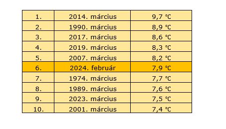 Olyannyira magas volt a február havi középhőmérséklet, hogy a március havi sokéves havi átlagok közé illik nagyságrendileg, sőt a márciusi TOP 10-ben a 6. helyet foglalja el. Ez azt jelenti, hogy az idei februárnál csak öt márciusi év volt melegebb 1962 óta.