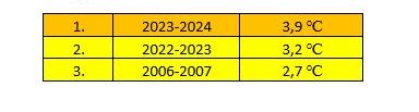 A február havi rekordok után a téli évszakok átlagait is csökkenő sorrendbe állítva 1962 óta, az eredmény nem volt meglepő. Az idei tél az elmúlt 62 év megmelegebb tele volt. A tavalyi tél 0,7°C-kal volt ennél hűvösebb. Az utolsó két tél szezon-átlagai 3? fölöttiek, a TOP 3-ban a harmadik helyen a 2006/2007-es tél már 3°C alatti, 2,7°C-os háromhavi átlaggal.