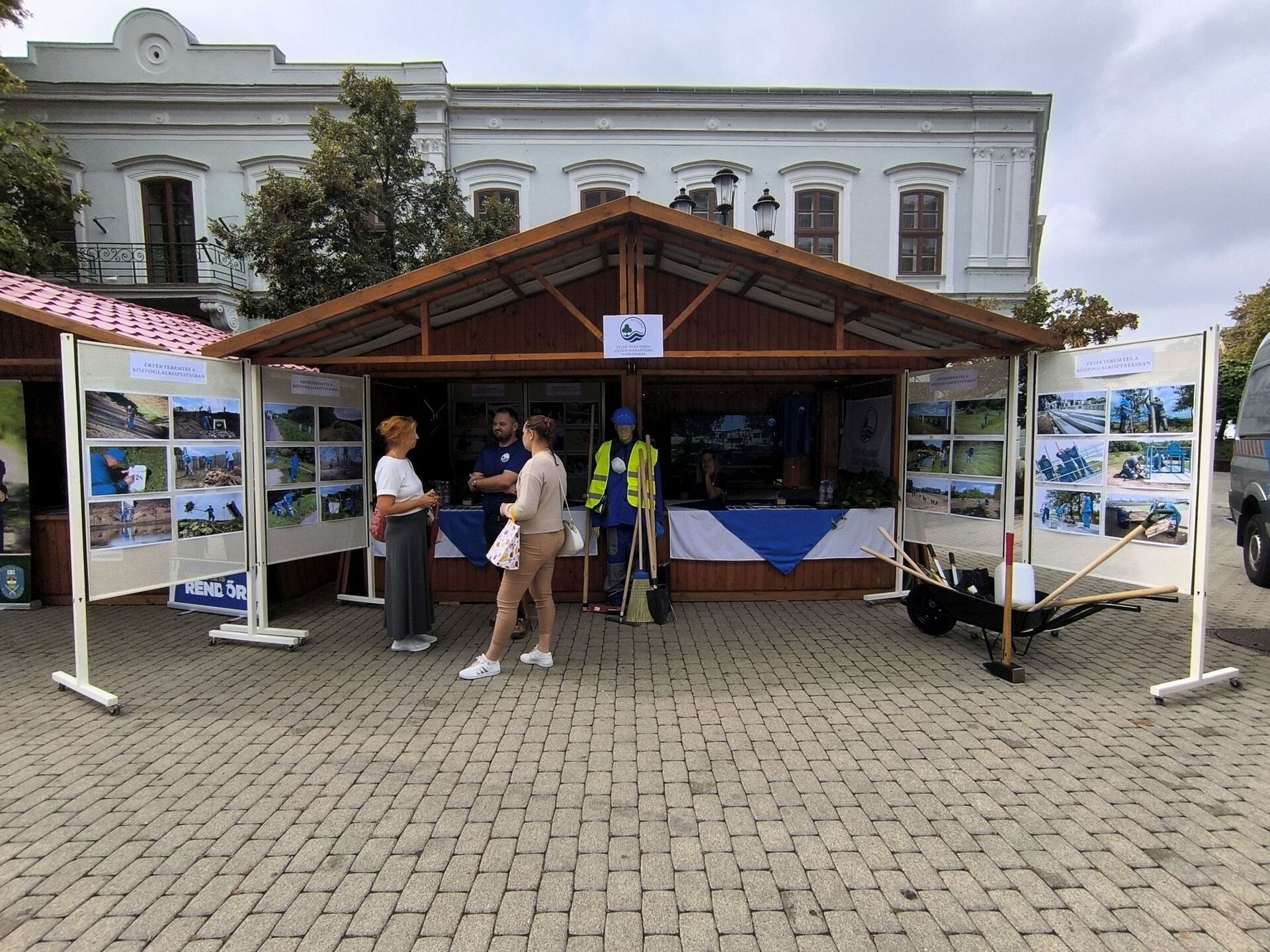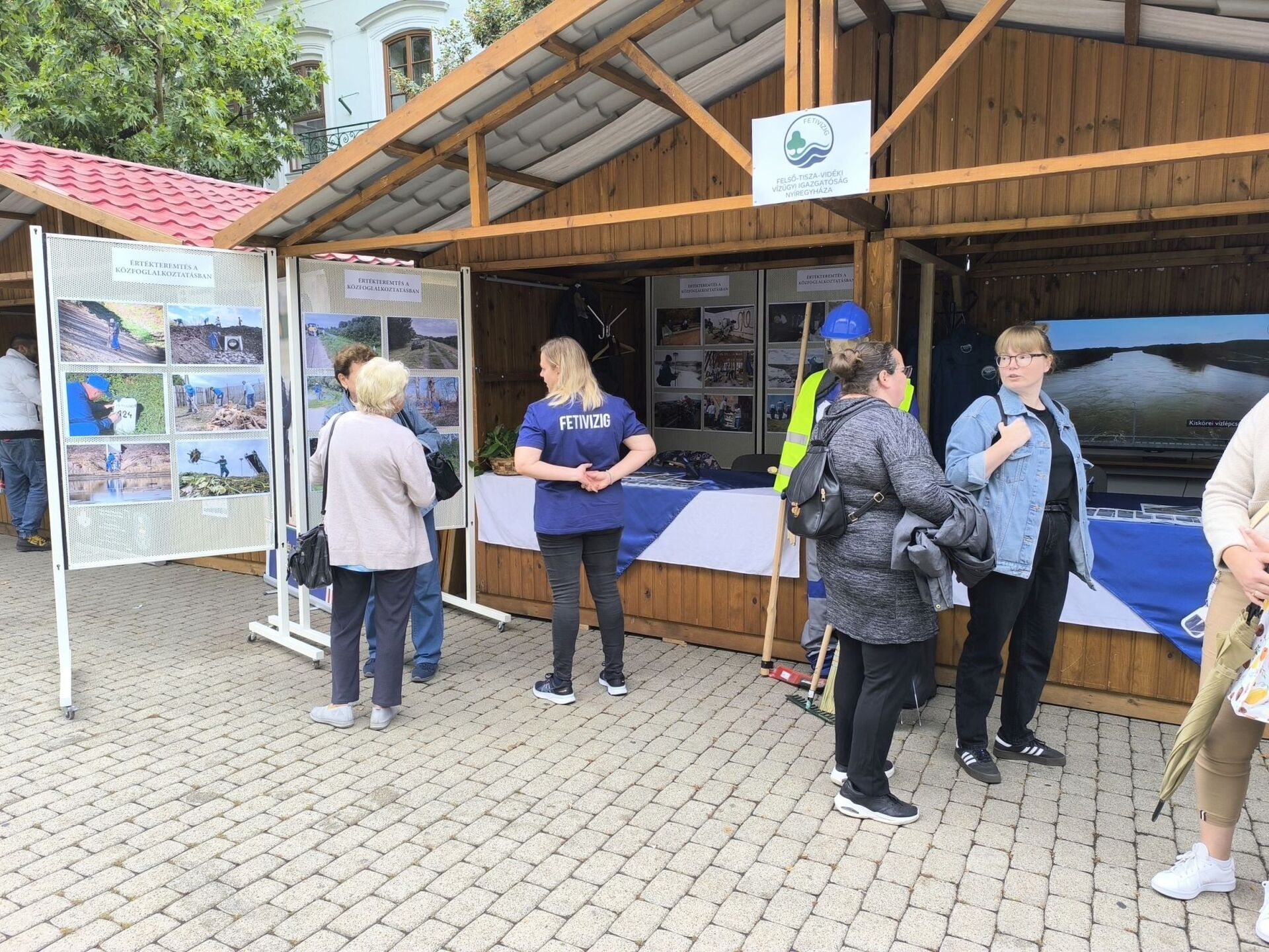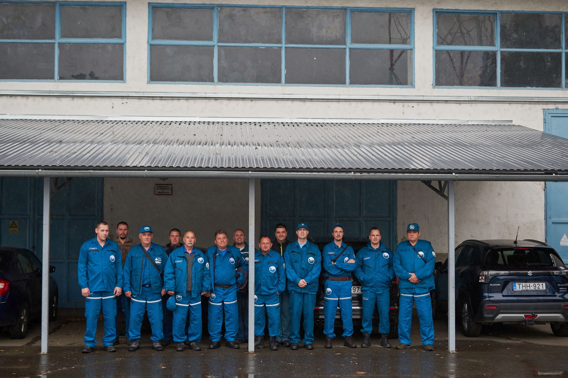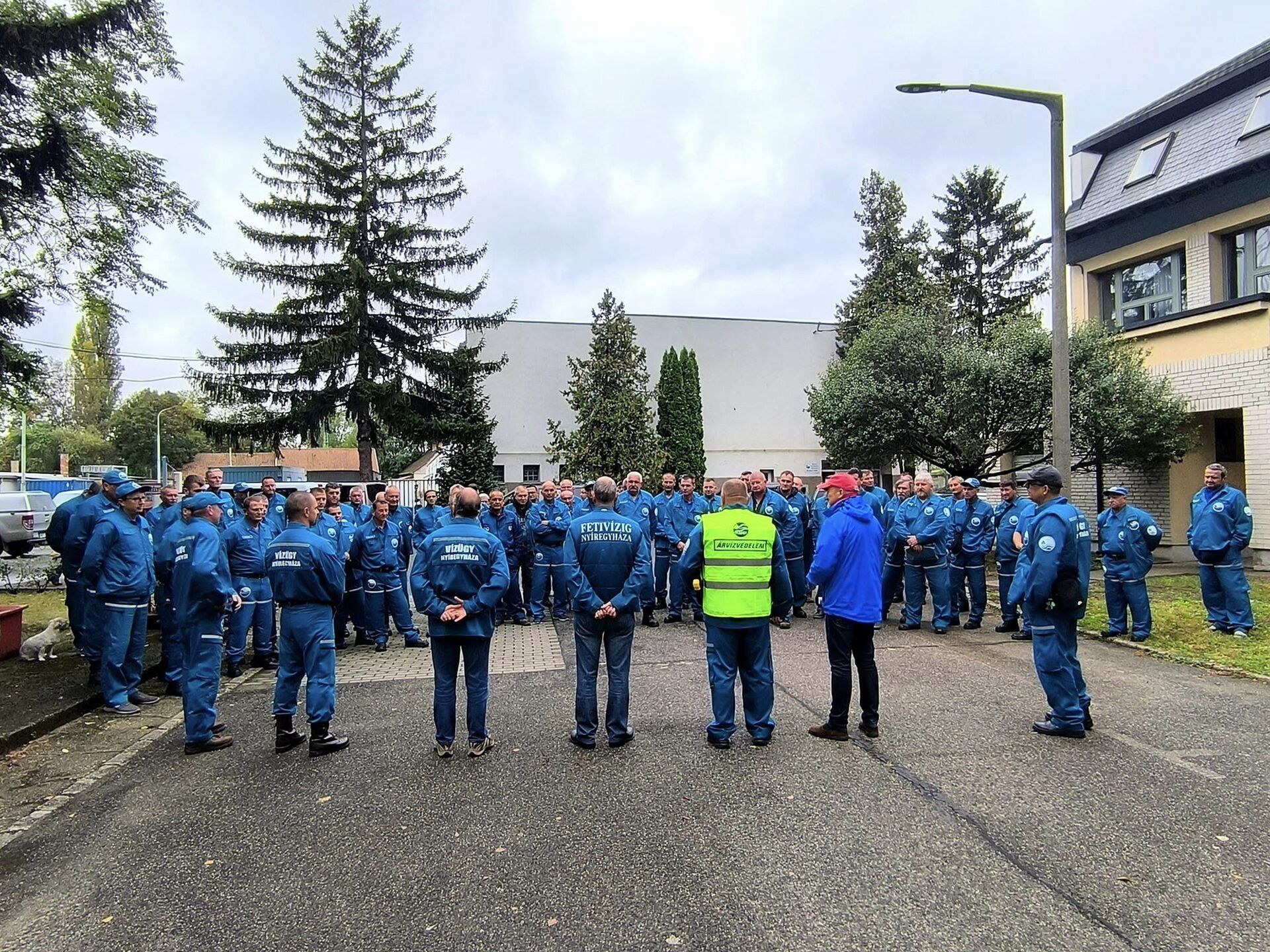 A képen a FETIVIZIG központi épülete látható Nyíregyházán, az épület előtt felsorakozott kék szolgálati ruhába öltözött emberekkel.