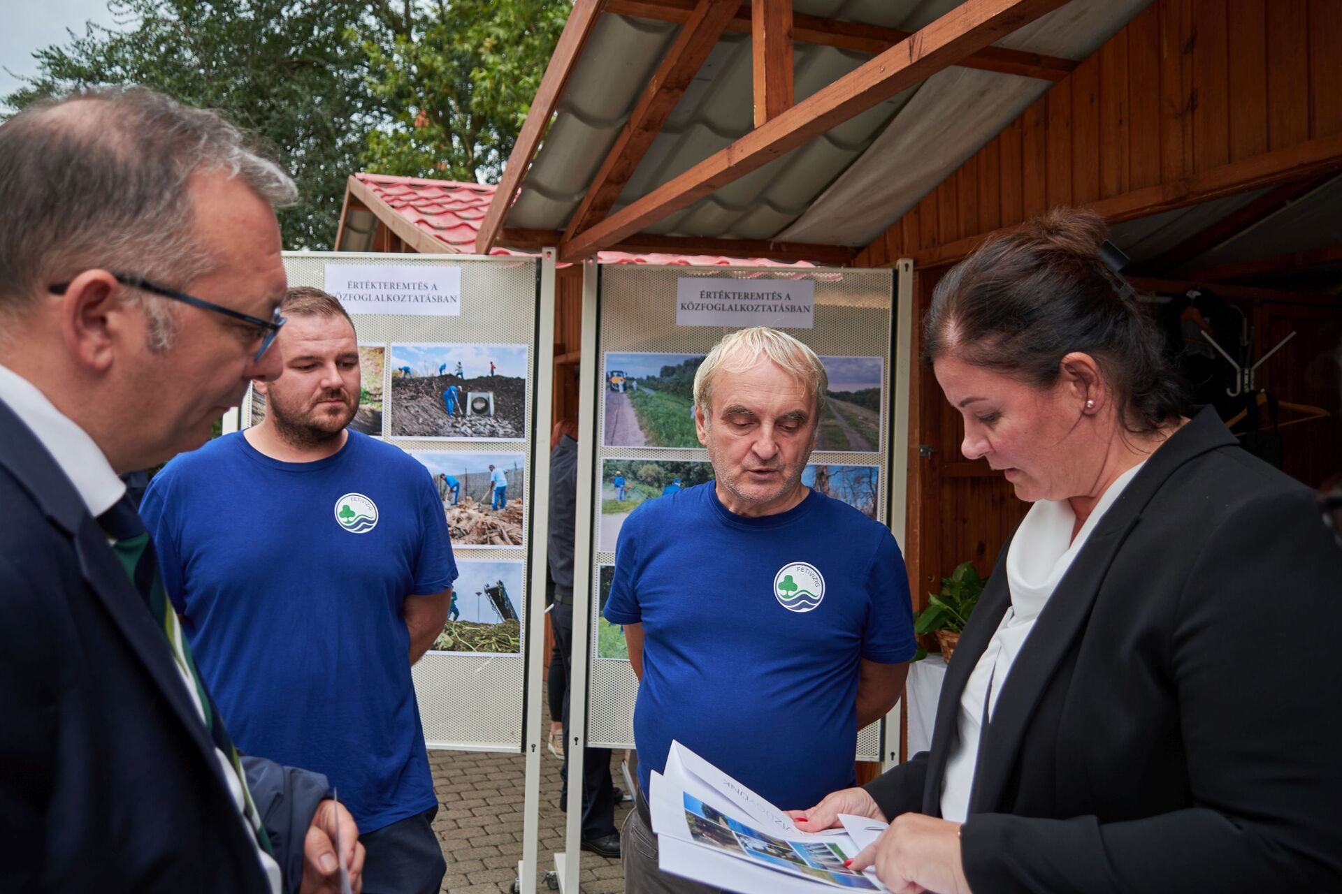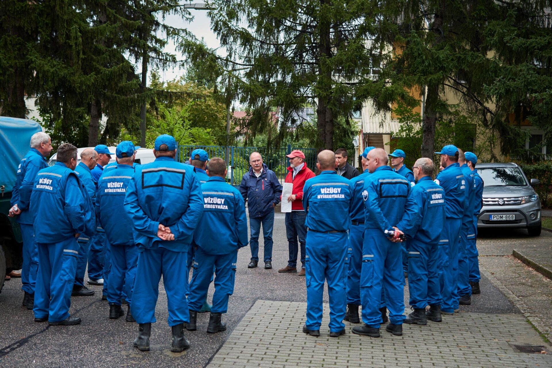 A képen Bodnár Gáspár igazgató úr látható kék vízügyes ruhába öltözött búcsúztató kollégái körében a FETIVIZIG központi épülete mellett, akik az utolsó munkanapjának reggelén sorfallal és tapssal köszöntötték őt.