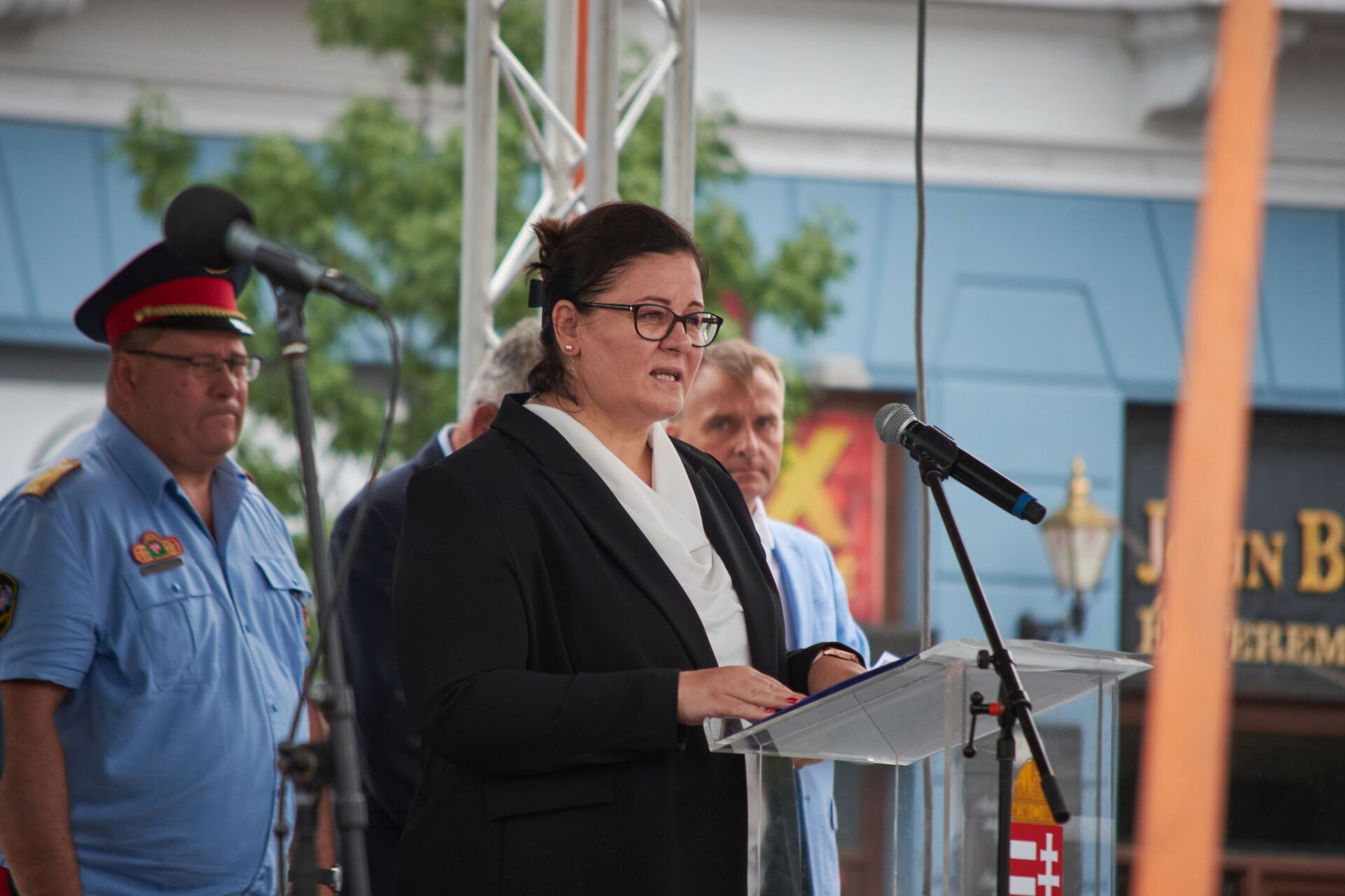 A képen Bodnár Gáspár igazgató úr látható egyenruhába öltözött búcsúztató kollégái körében.