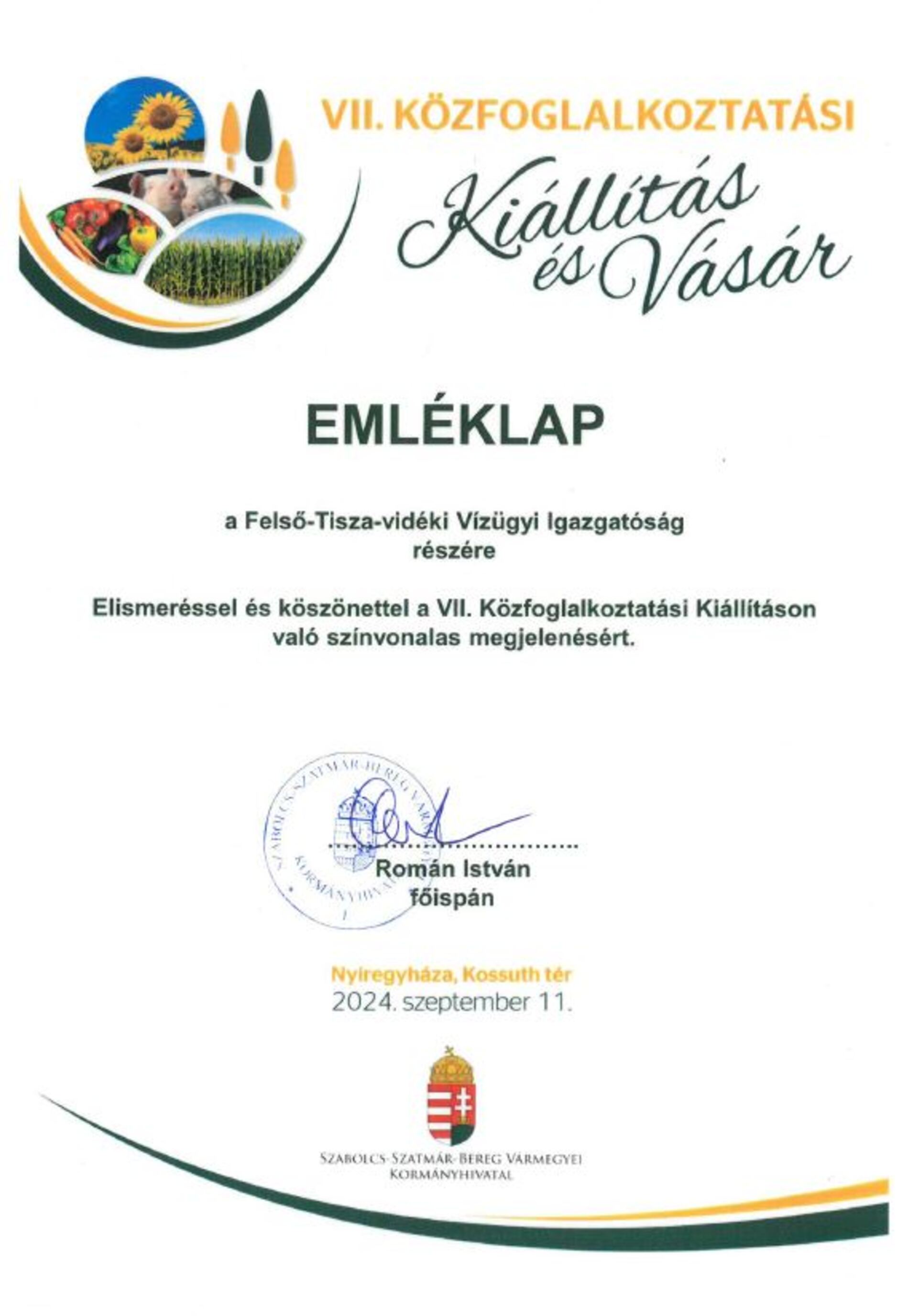 A képen az Elismerő Oklevél látható a következő szövegezéssel: „Elismerő Oklevél Dr. Kiss Anna, Lucza Zoltán, Szabó János Adolf részére a Magyar Hidrológiai Társaság X.L.I. Országos Vándorgyűlésen a Vízkárelhárítási Szekcióban előadott Klímaváltozási hatáselemzések és a valós folyamatok összevetése a Felső-Tisza téli árhullámainak alakulása című kiemelkedő színvonalú dolgozatáéért.”